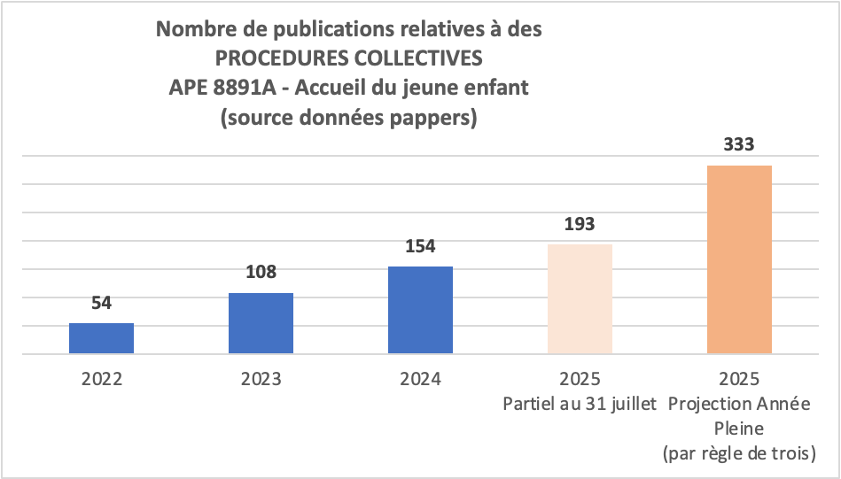 | Période | Nombre de publications relatives à des PROCEDURES COLLECTIVES APE 8891A – Accueil du jeune enfant (source données pappers) |